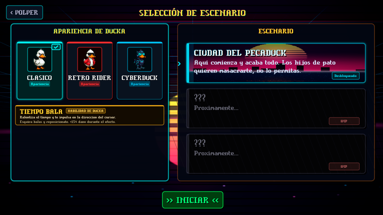 Para conseguirlo, dispondrás de un arsenal de armas y poderes cuackticos que convierten cada run en una experiencia única. Elimina enemigos, recolecta oro y úsalo para comprar mejoras permanentes que te harán cada vez más letal.